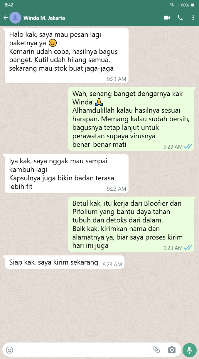 "Setelah pakai, kutil saya hilang semua. Badan juga terasa lebih fit, makanya saya pesan lagi buat stok jaga-jaga."